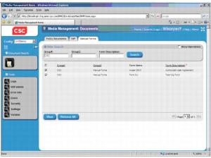 a Check the left check boxes for the forms that you want to include in the document. If the "Select All" button is available, then you can click it to check all forms. After clicking this button, it changes to a "Remove All" button, which will uncheck all forms.The new document will contain information from a provided Document Production extract file. The XmlDemo configuration uses a default extract file. In most manual forms implementations, the extract file will be provided by an external application like Agency Link when the user enters Media Management.4 If the new document requires manual data entry then the document will open in edit mode. Otherwise, the document will open in preview mode (see step 5). On the Manual Forms edit page, the user can modify document fields. The following operations are available:
